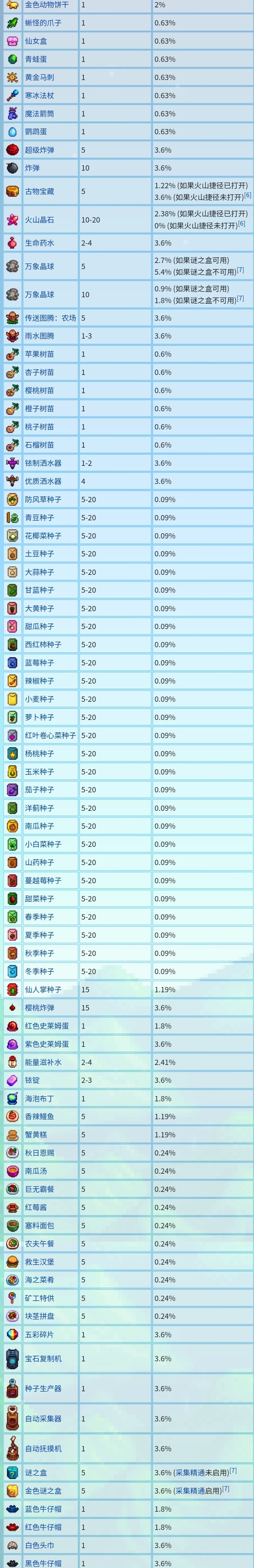 特點:骷髏礦洞不像深山礦洞只有120層,骷髏礦洞層數是沒有限制的,並且層數越高,後面找到銥礦石的概率也越高;骷髏礦洞生成梯子有20%的概率變爲豎井,它允許我們可以跳過3-15層;骷髏礦洞中也有類似礦井整十數層的寶箱,寶藏房間是穿插在洞穴裏的一些只有一個寶箱的房間,它們會在10+層中隨機出現,在第100層、第200層、第300層必有一、二、三個寶箱,並且有着獨有的外觀。