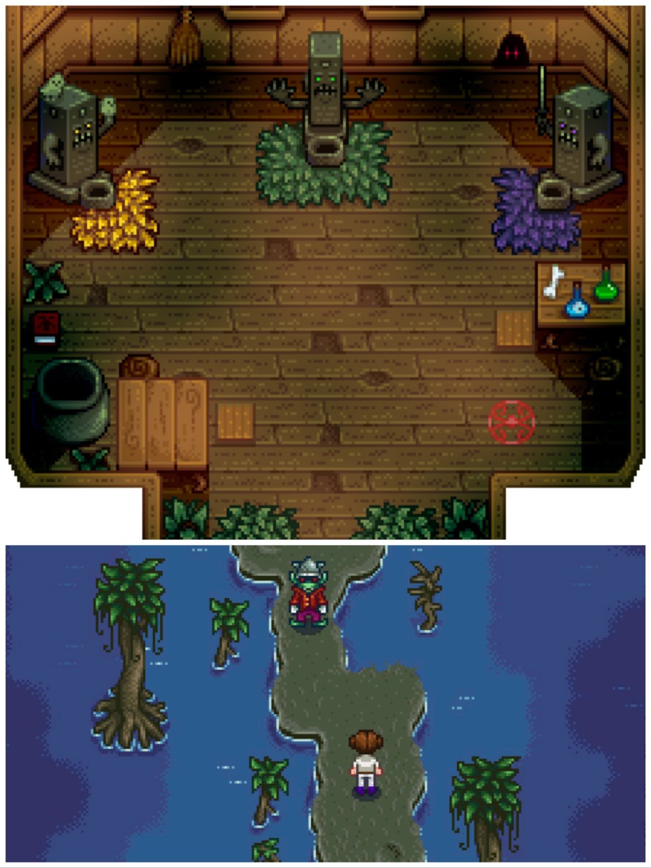 開啓方式:姜島開啓需要完成全部社區獻祭任務,修復社區中心或是完成Joja社區發展申請書後,會收到威利的郵件,邀請你去魚店的裏屋。前往魚店的裏屋後,玩家可以花費200個硬木、5個電池組和5個銥錠修復裏面的舊船,之後便可以花費1000金在那裏購買船票坐船前往姜島。