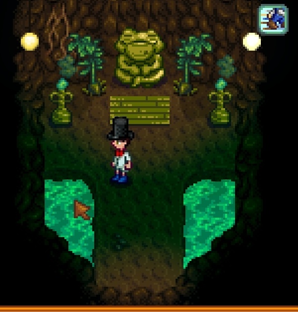 特點:洞穴內有一隻巨大的青蛙,完成它的任務可以獲得5個金核桃,兩旁的水池只能釣出青蛙帽或者垃圾。