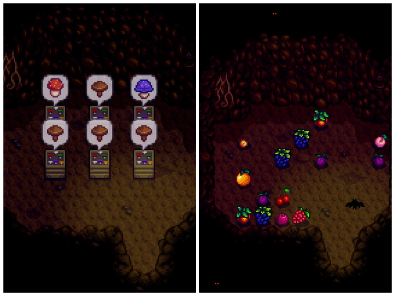 特點:選擇果蝠會在農場的山洞中留下各種水果,並且水果類型不會受季節的限制,山洞中產出的水果將會一直留在那,直到玩家採集爲止;選擇蘑菇山洞後,山洞中會添加六個蘑菇培養盆,隨機生長除了熔岩菇以外的所有5種蘑菇。