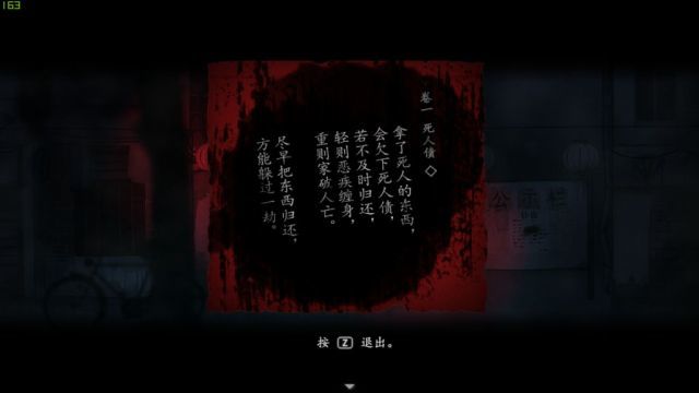 但很显然,尽管以<严法经>的恶鬼描述作为开场,作者并没有将制作一个“高代入感”的鬼故事作为目的,比如他并没有使用主视角,第三视角几乎将jump scare的效果降低了最低,而游戏中几乎没有设置让玩家“游戏失败”的可能性——游戏失败带来的压迫感会增加玩家的紧张感与代入感。