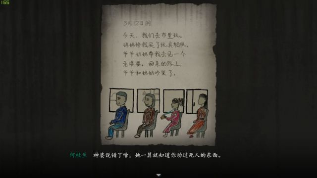 在叙事手法方面,<烟火>相对于<黑森町奇谭>有很大程度的进步:游戏中涉及到大量灵异场景的“转场”本身是比较“跳跃”的,但通过孩子的绘图日记本、水墨画、甚至是作业本等等方式实现了巧妙的场景转换和叙事表达,从“游戏设计”的角度来说,这些巧妙的叙事方式充分体现了独立游戏天马行空的想象力和锐意创新的制作精神,是让人最为惊喜的地方。