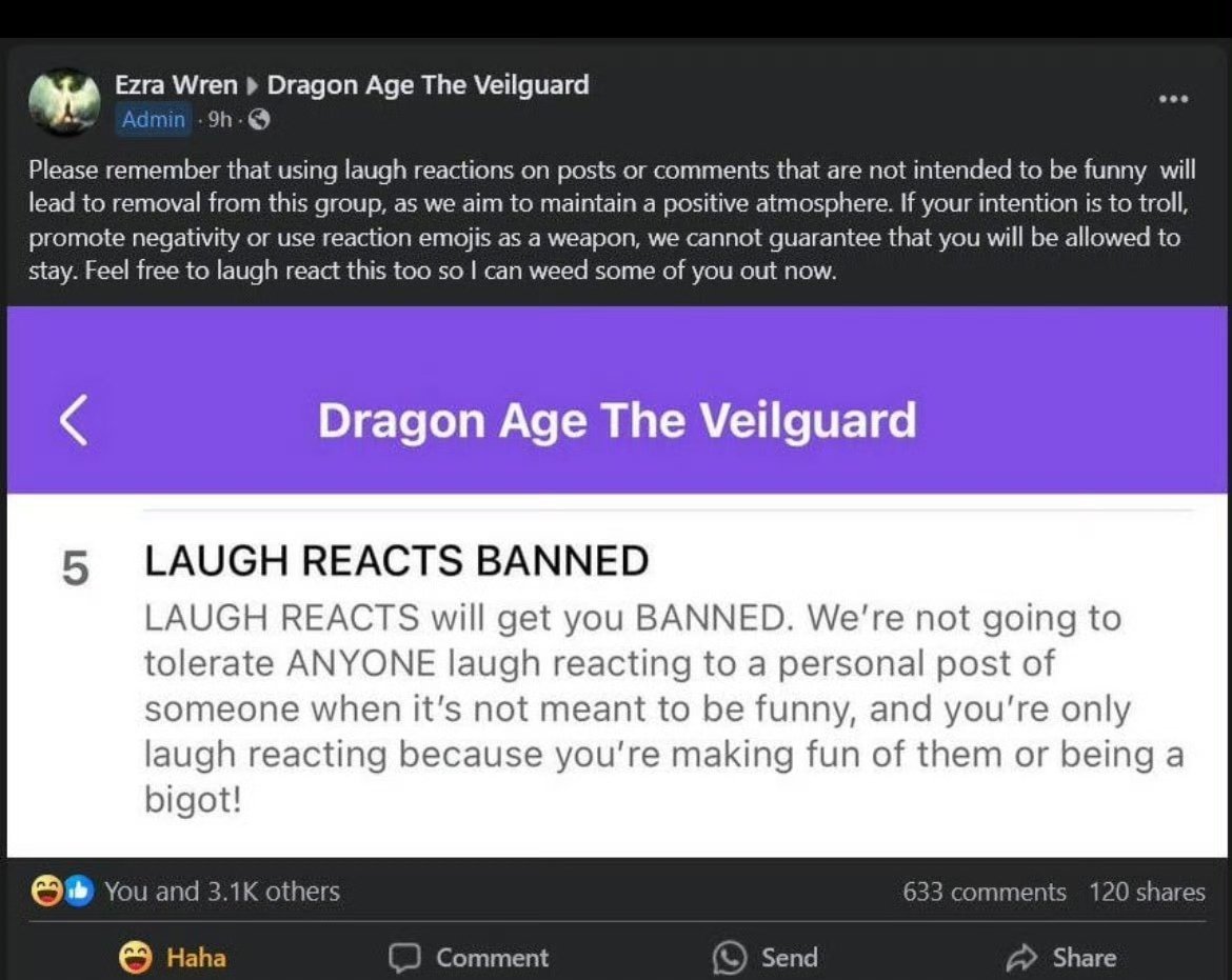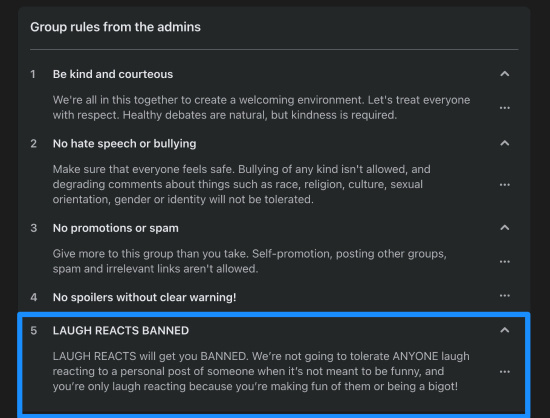 “請記住,如果您在帖子或評論中使用大笑的表情,而這些帖子或評論並非爲了搞笑,那麼您將被從該羣組中除名,因爲我們的目標是保持積極的氛圍。如果您的意圖是挑釁、傳播消極情緒或使用表情符號作爲武器,我們不能保證您能繼續留在羣組中。您也可以隨意對此做出大笑的表情,這樣我現在就可以淘汰你們中的一些人了”。