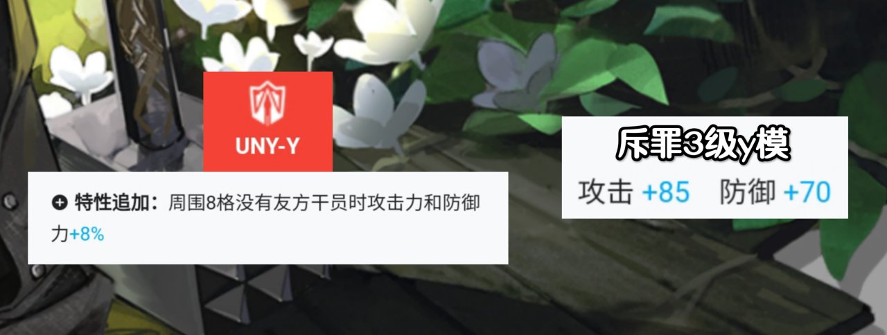 注意y模特性+8%攻防的效果僅在周圍8格無友軍的情況下生效,一般需要脫離隊伍,那麼③的嘲諷就容易不起作用(除非有全圖攻擊的敵人),個人認爲x模的輸出也夠了