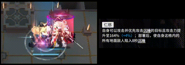②技能受回12技力,消耗低,短持續,實戰中持續接敵頻繁開,實現沉睡+回血的循環,劍雨範圍不跳綠字的回血,沉睡是不限敵人數量的羣控,三個技能裏最喜歡的