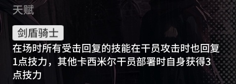 瑕光第一天賦使其主動攻擊敵人時回覆1技力,攻回+受回,對所有受回幹員有效,比較有含金量的天賦,攜帶y模還能搭配其他卡西米爾幹員補充技力,受回也無所謂了