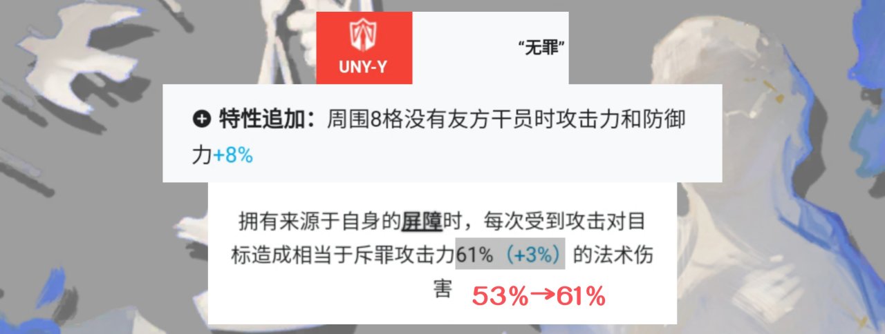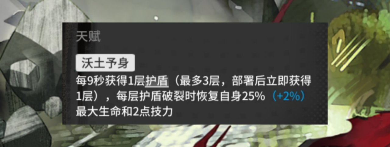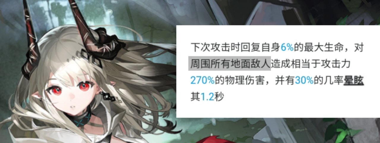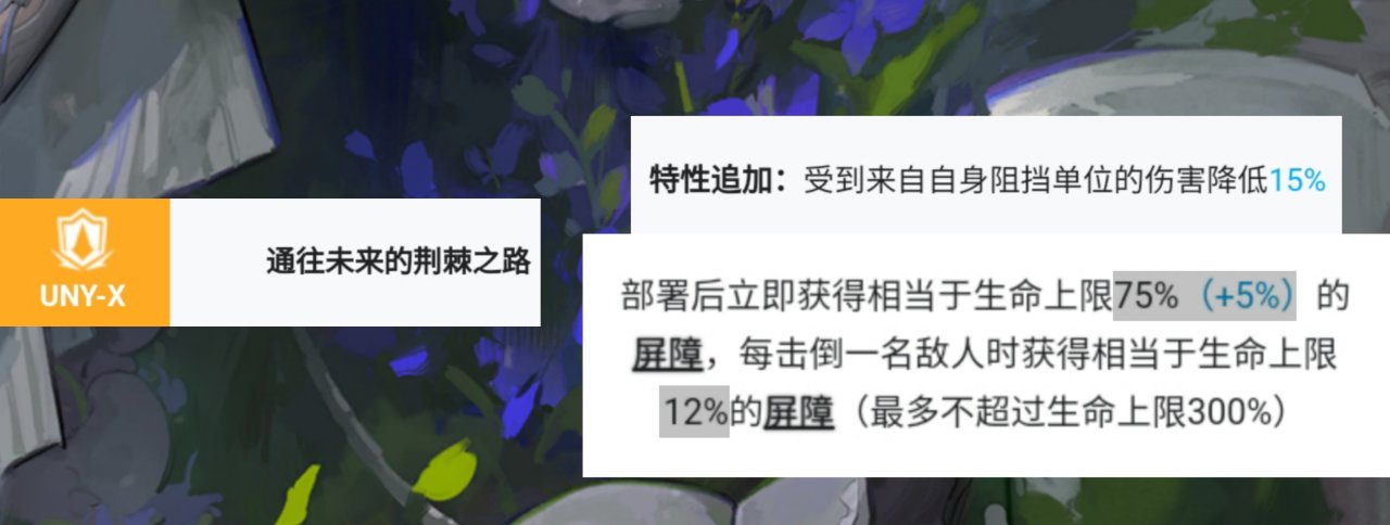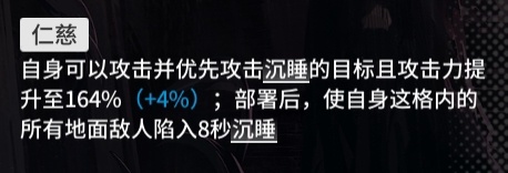 ②技能+第一天賦都能回血,保證穩定站場,x模特性阻擋減傷15%,第二天賦對薩卡茲敵人還有30%減傷,硬度很高,30%概率暈眩1.2秒算是個添頭,但觸發頻率也不算低