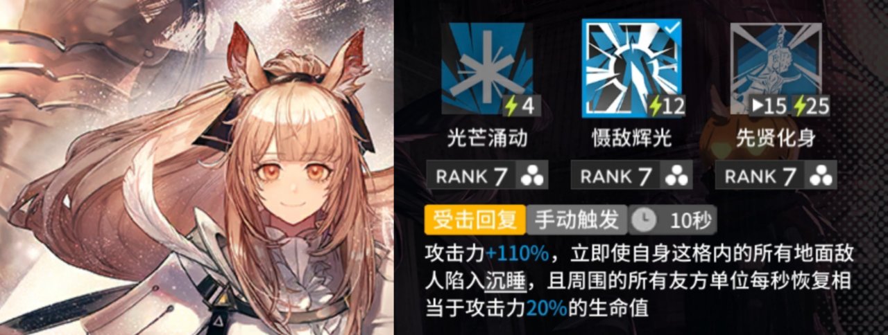 持續受擊才能保證技能頻繁觸發,一般部署在前排接敵,敵人的攻速也影響受回技能的啓動速度,越快越好,瑕光②③技能都是受回,不過第一天賦可以額外回覆技力