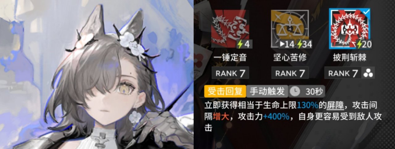 斥罪③技能和瑕光③一樣持續30秒,受回20技力差不多也是瑕光③(25技力)一檔的,具備高額屏障+高額攻擊力,不過攻速降至2.5秒和重劍手一樣,30秒打12次