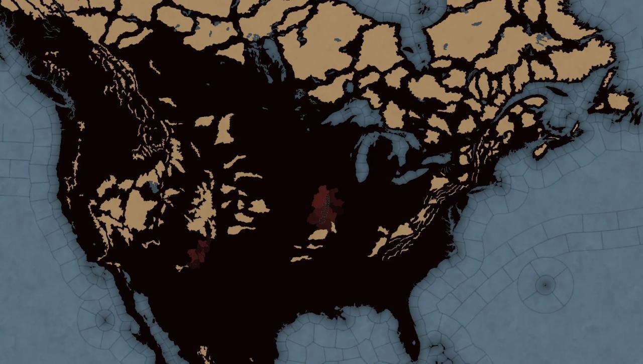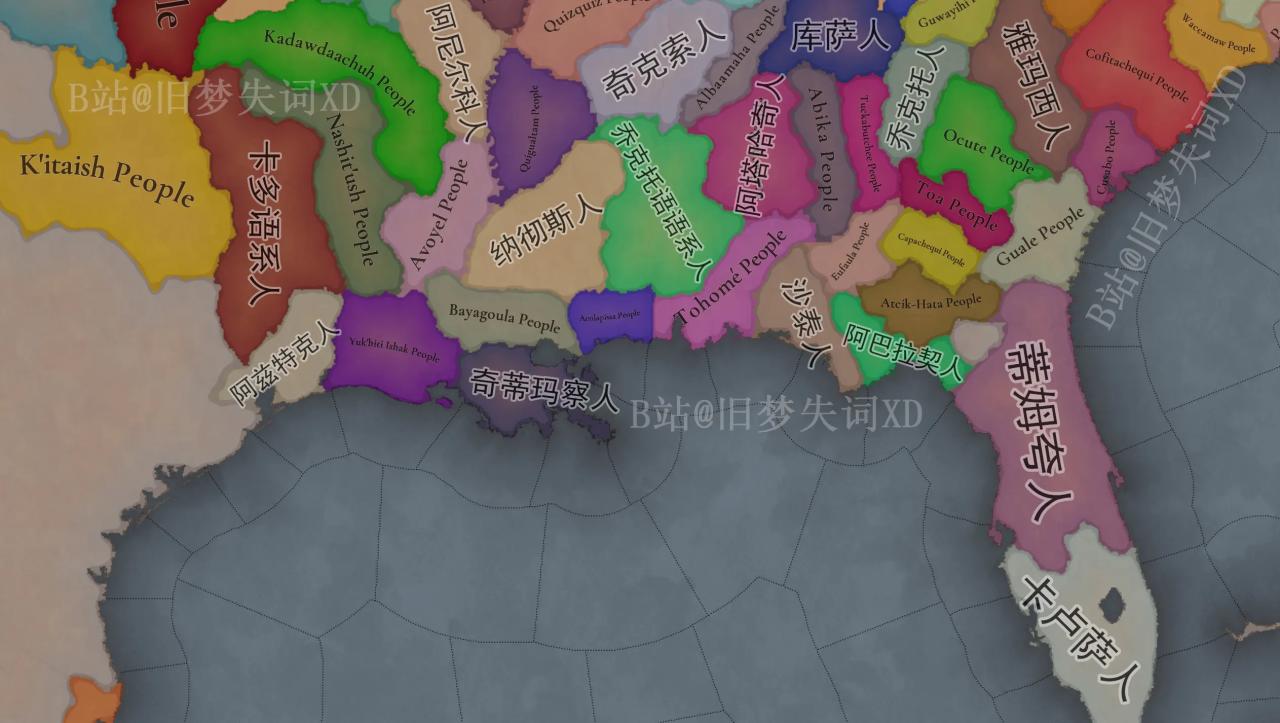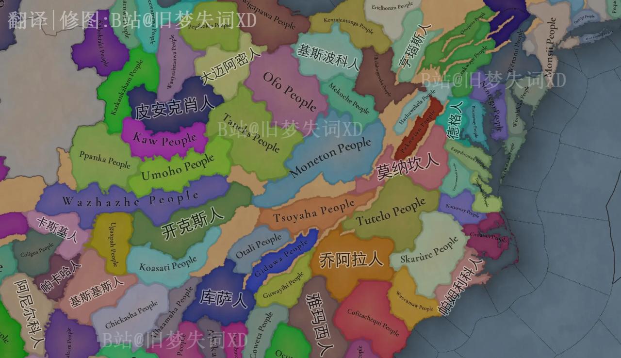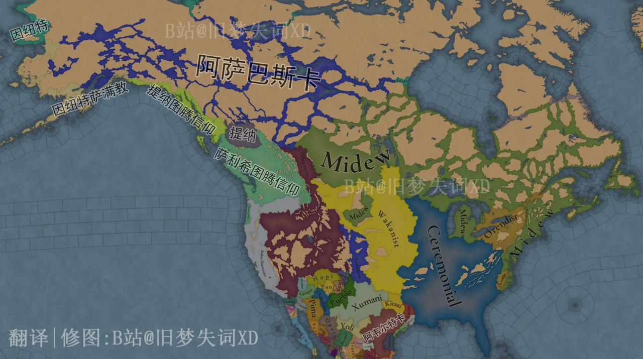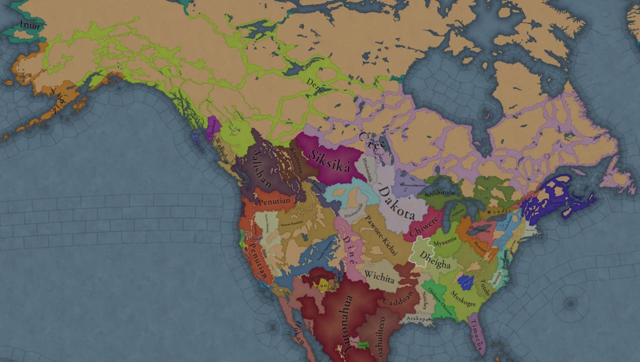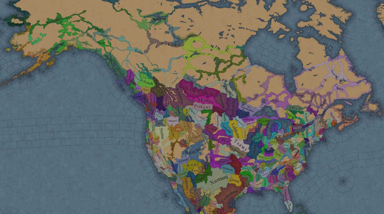 本期開發日誌我認爲應該把有地國家和無國家社會放一起講。正如我們上週日誌所述,我們嘗試按照一個統一的標準來區分有地國家和無國家社會。如圖所示,卡霍基亞人和一些普韋布洛人是1337年唯一的有地國家,而其周圍則是許多無國家社會。由於缺少史料考證,因此都是隨機的王朝,所以本期沒有王朝地圖。