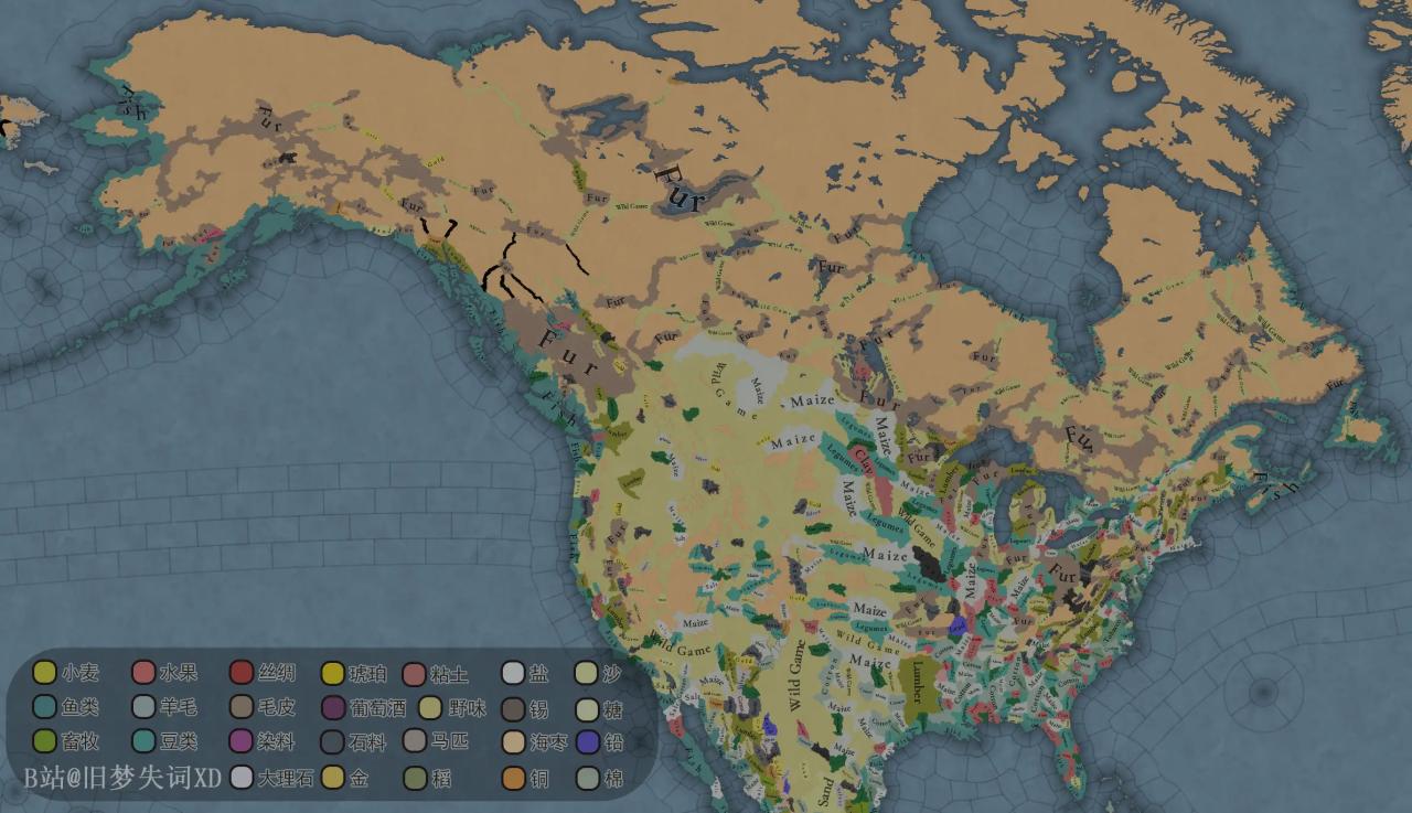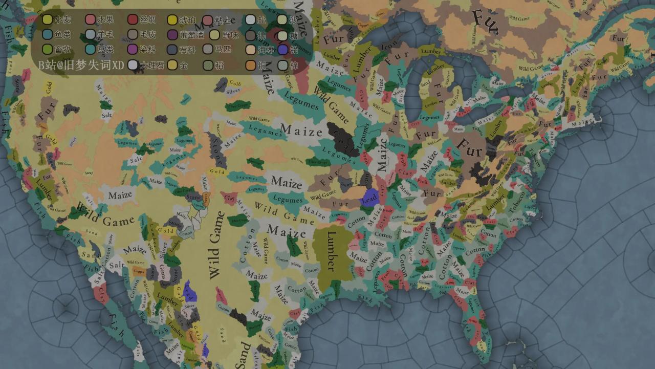 該地區盛產野生動物、魚類和皮毛。但我們也製作了玉米、豆類和南瓜這仨組合,這是許多美洲原住民社會的農業基礎,在地圖中它們分別命名爲Maize、Legumes和Fruit。棉花也分佈於南部,因爲它也是該地區的原生植物,還有一些礦產資源。