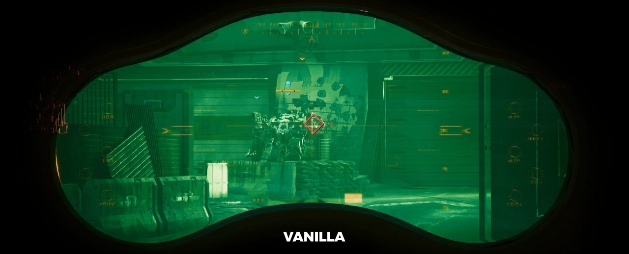 去除了瞄準鏡的綠色色調,毛刺,掃描線,減少了失真和眩暈。