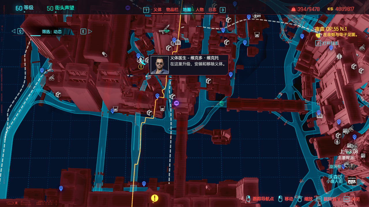 地圖上顯示的圖標會標識出真實名稱而不是通用標籤,比如點擊老維的義體店會顯示【維克多·維克托】而不是顯示【義體醫生】,點擊來生酒吧會顯示【來生】而不是顯示【酒吧】