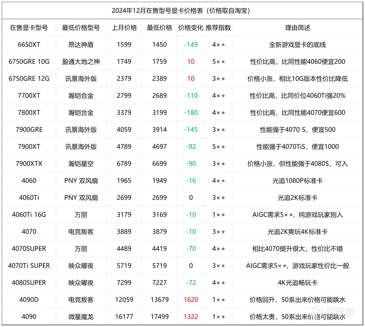 本月顯卡價格相比上個月大部分型號價格小降,中端熱門型號4060/4060Ti、6750GRE價格基本沒多大變化,中高端顯卡價格相比上個月降了一些,4090/4090D因爲停產價格大幅上漲,不過這兩個的目標羣體本來就不是主流用戶,所以影響不大。