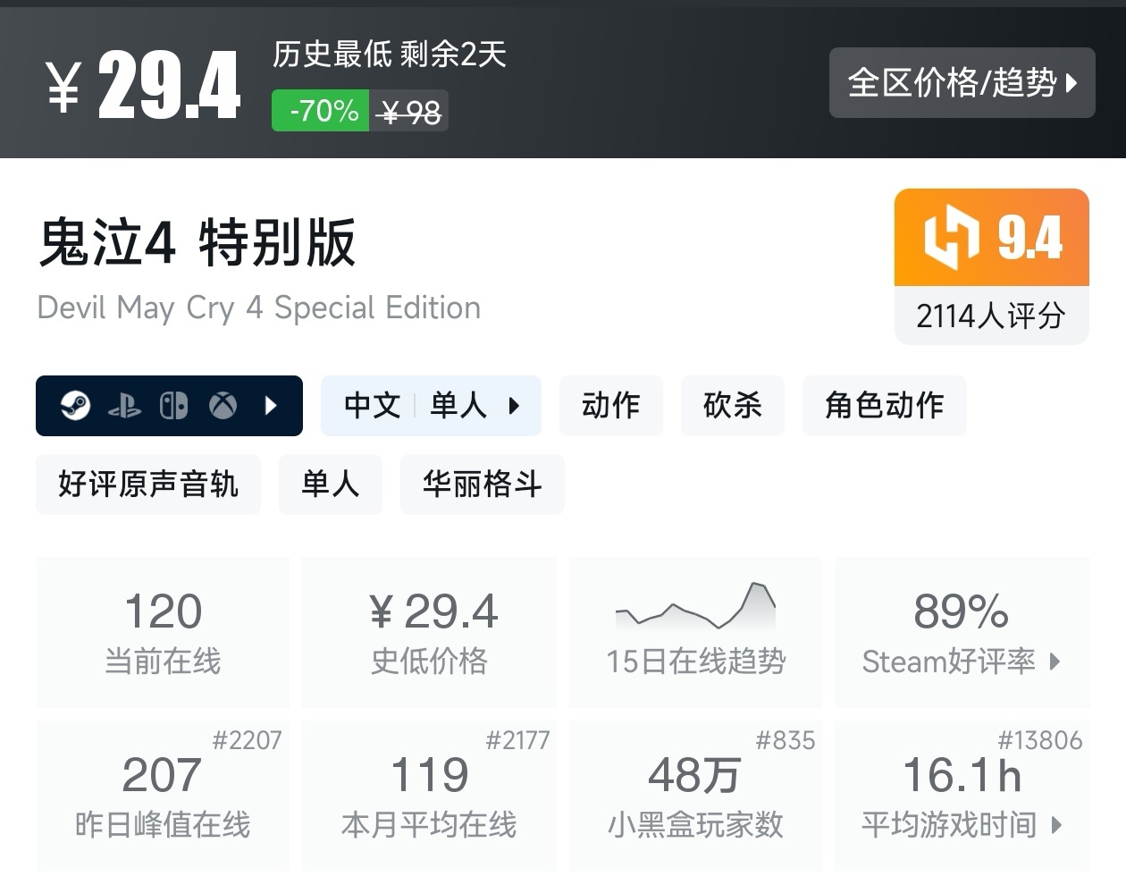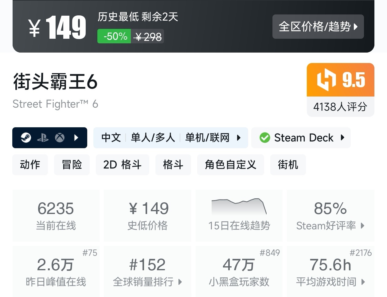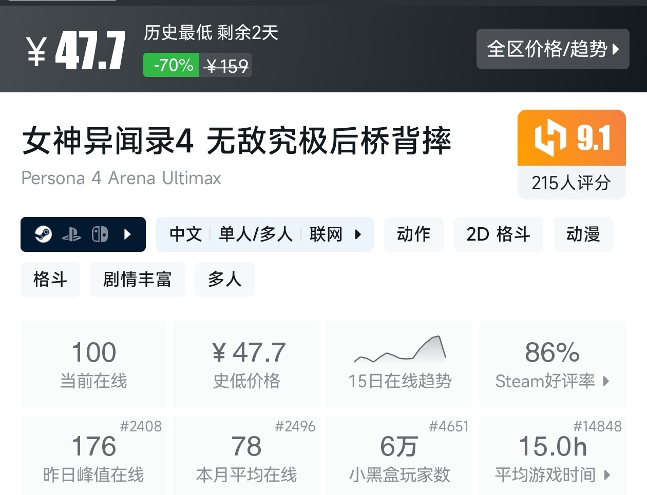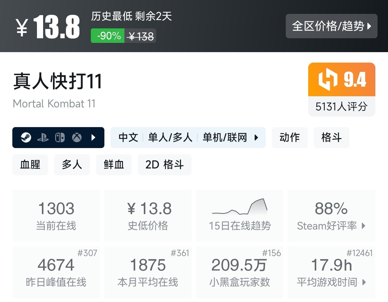 大家好,转眼就快到系列折扣汇总的第十期了,这一期给大家带来的是战斗/格斗游戏的折扣汇总,做这一期我用了相当严谨的筛选标准,因为动作/格斗游戏主打的就是一手战斗爽,所以我几乎排除了魂游与类魂,留下来的都是人物机动性高的游戏,希望我的汇总,能够帮助各位盒友挑选心仪的游戏。