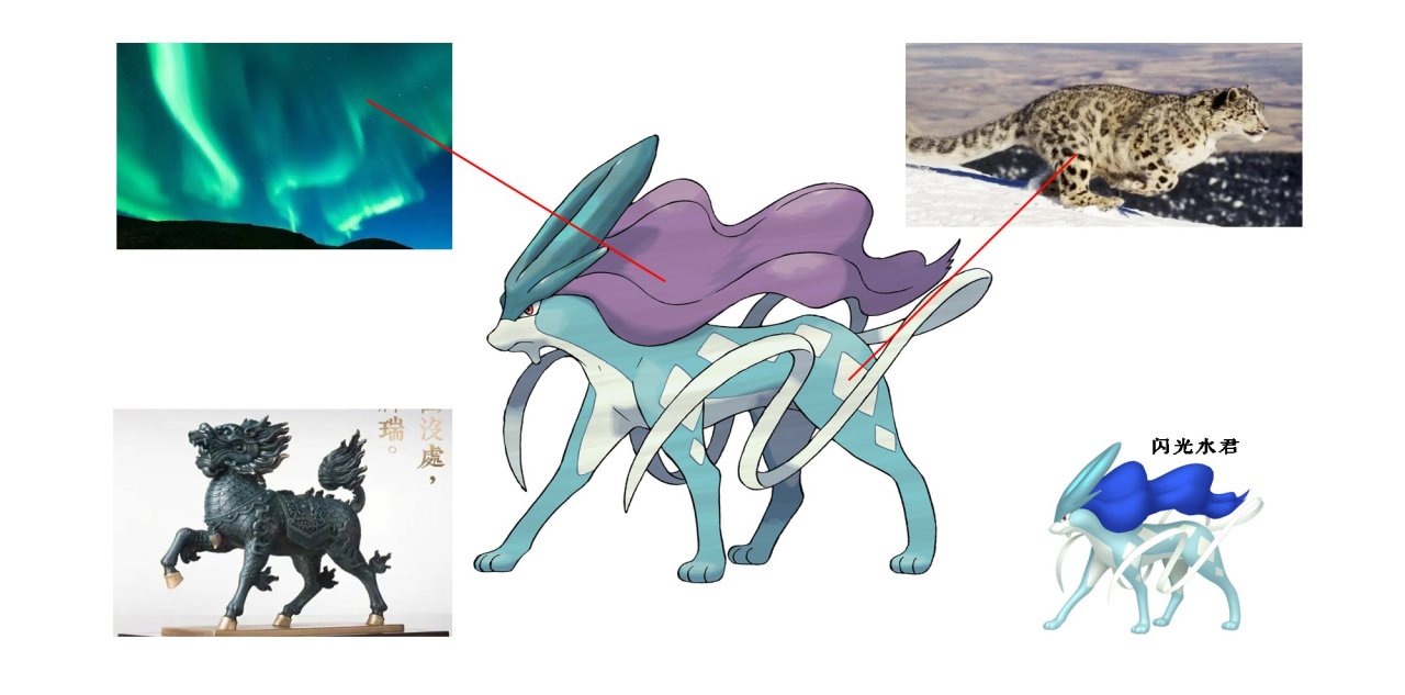 旅途動畫中名聲一落千丈的神獸之恥,水君是與原型變體程度相當大的寶可夢,讓人很難一眼辨認出設計來源。雖然外觀看起來更像狗或狼,但他的設計原型裏最多的是豹和麒麟。水君的頭冠爲長六邊形,類似水晶體(其作爲封面登場的作品即水晶版),兩側有分叉類似鹿角,可以像麒麟一樣在水上行走。豹在日本文化中與麒麟一樣象徵着強大祥瑞,身上的白色菱形斑點與雪豹類方形的斑點接近,日本也有披着豹皮的北風之神的傳說。水君腦後飄逸的毛髮和飄帶似的尾巴類似極光的波浪,這也符合它跟隨北風出現的設定。水君是體內蘊藏着泉水般溫柔的寶可夢,追尋着流淌着清澈水流的地方。它會用滑行一樣的動作在大地上四處奔跑,擁有瞬間淨化骯髒渾水的力量。