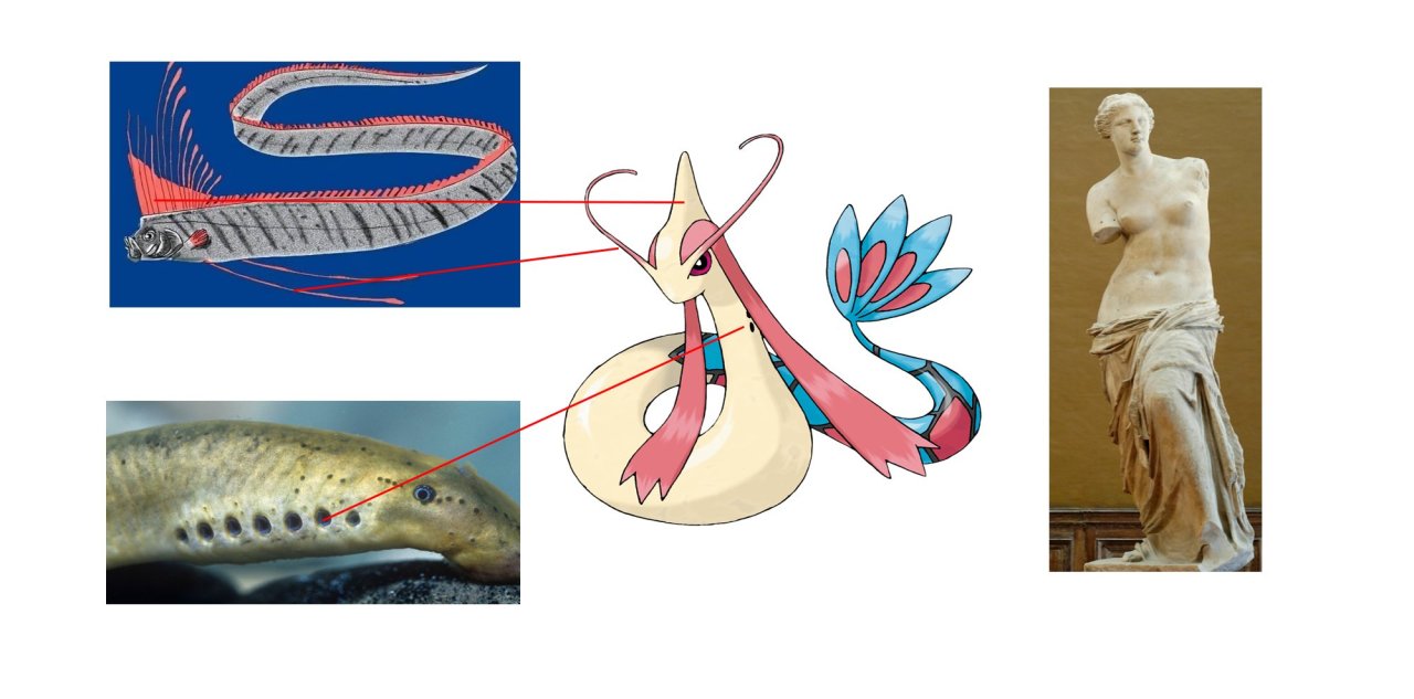 遺憾的是,碧海龍的圖鑑介紹並不能讓人從現實中找到原型生物,某些部件例如尾巴的珠子、頭髮和飄帶更是把不同生物的特徵化設計結合到一起,難免會造成既視感過重的情況。那麼順着這些被拆分的部件,我們來看一看GF是怎麼處理和設計現實生物的。