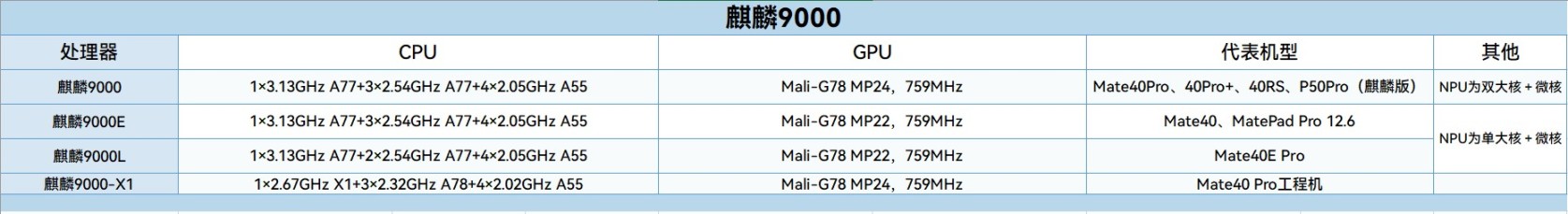 麒麟9000的X1超大核版,還用上了A78大核,可能是時間來不及了,華爲最終沒有投產。