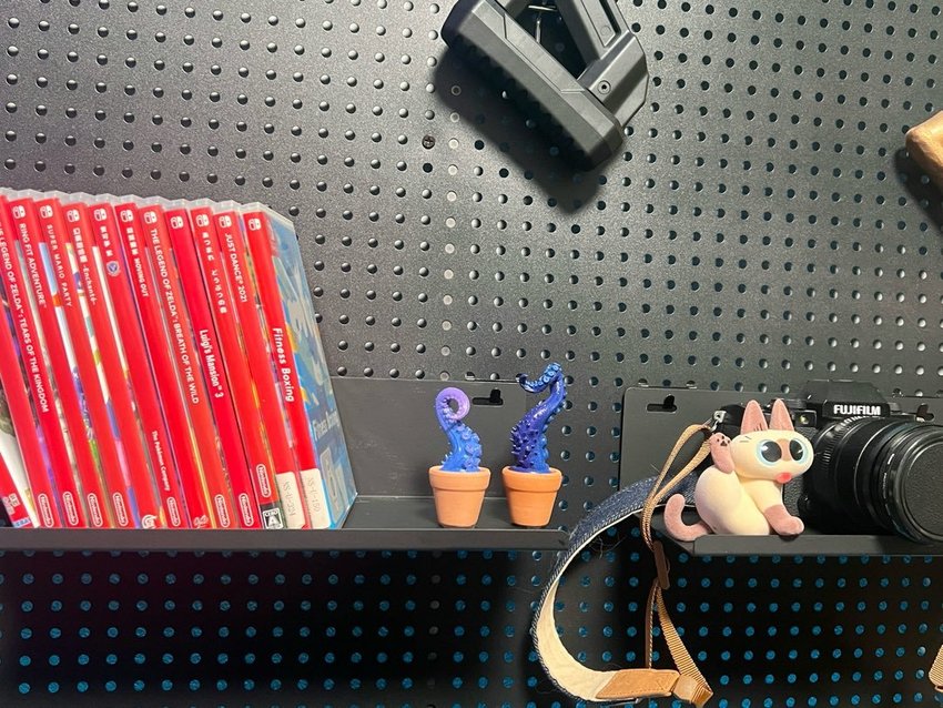 洞洞板是用膨脹螺絲掛上去的,承重一般,右下角那把狙比較沉,掛上去板子有部分形變。