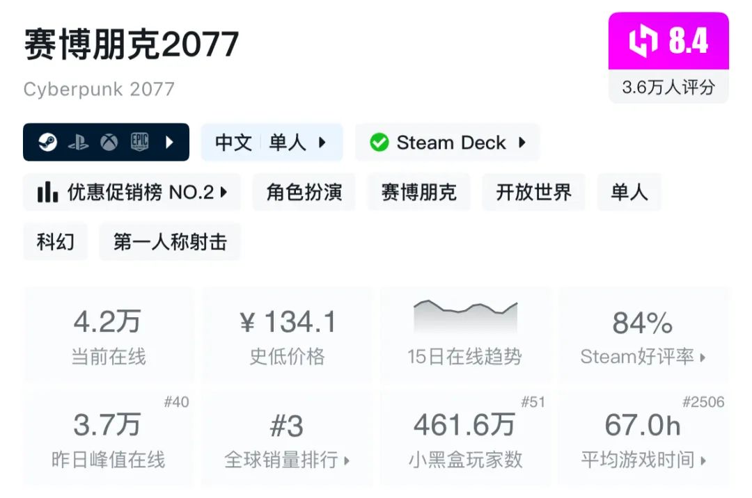 喜欢这种题材的玩家也确实多。11月24日,《赛博朋克2077》官宣总销量突破3000万,而仅在小黑盒平台上,中国用户就高达460万,考虑到非小黑盒用户和主机玩家,中国玩家数量或许远比这个数字更高。
