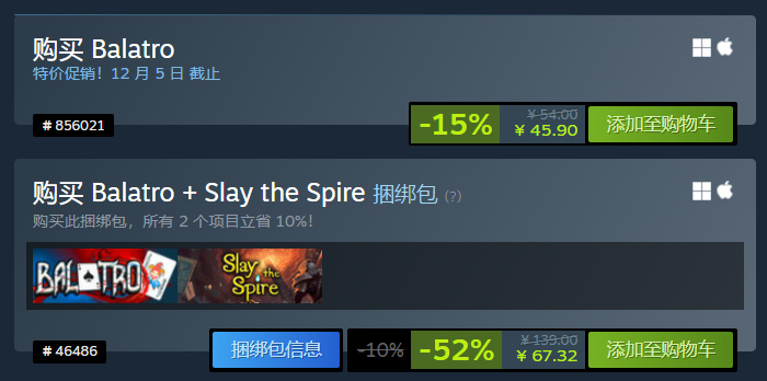 卡牌构筑类一向是肉鸽游戏中的常青树,这类游戏大部分都将即时战斗变成了回合制,对想体验肉鸽游戏的动作苦手玩家比较友好。2024年绕不过去的此类游戏当属《小丑牌》,毕竟是TGA年度最佳游戏提名,含金量拉满。目前秋促价格为史低8.5折,原54现45.90,还能和《杀戮尖塔》一起购买捆绑包。
