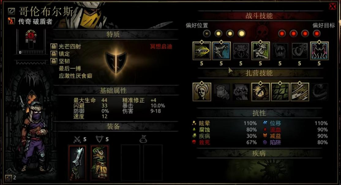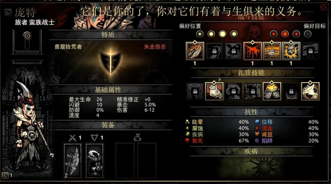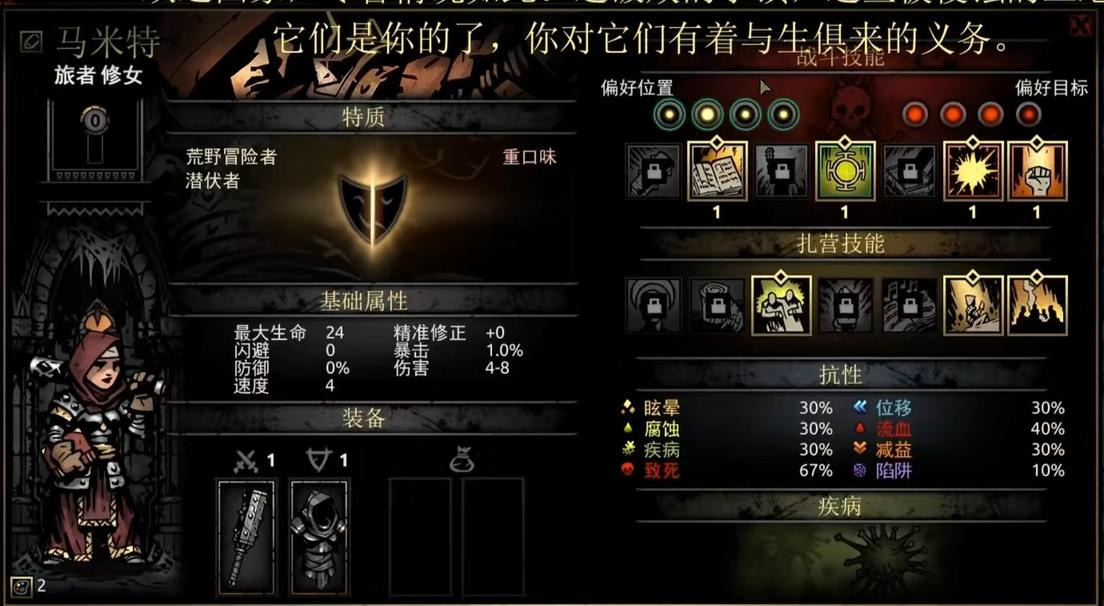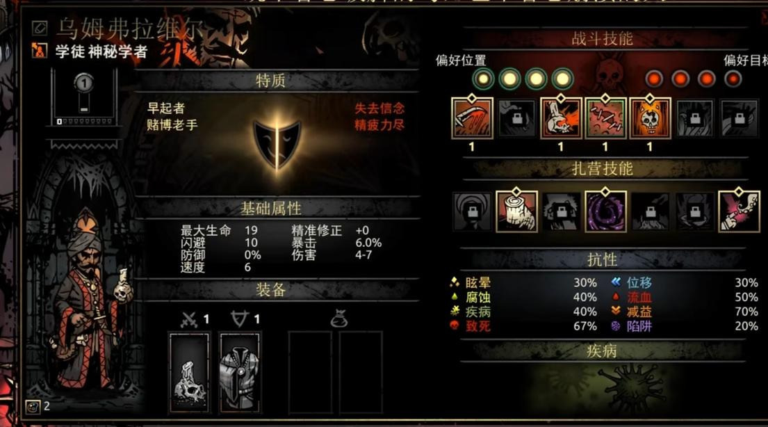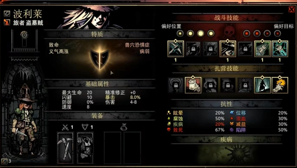 她的扎营技能“宿醉狂欢”可谓神技,只需要3点扎营点数和4个草药就能让全队-20压外加四场战斗的压力减免。7技能以3点扎营点数的代价换取四场战斗+10%的暴击率,打boss前或扎营点数有富裕可以用它。6技能则相对乏力,如果队伍带狗哥且恶女压力偏高的情况下可以使用。4技能在队伍确保不会乱位的情况下使用是很物超所值的。