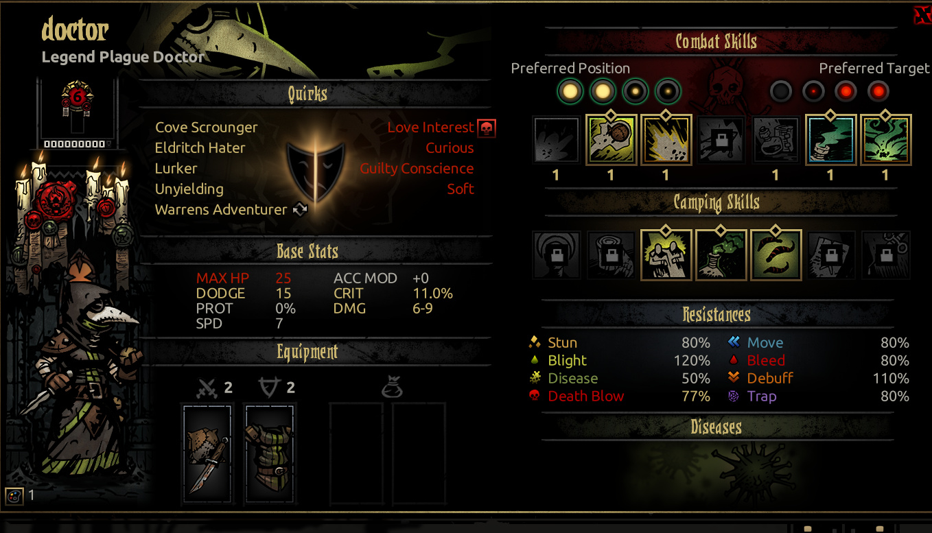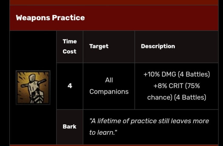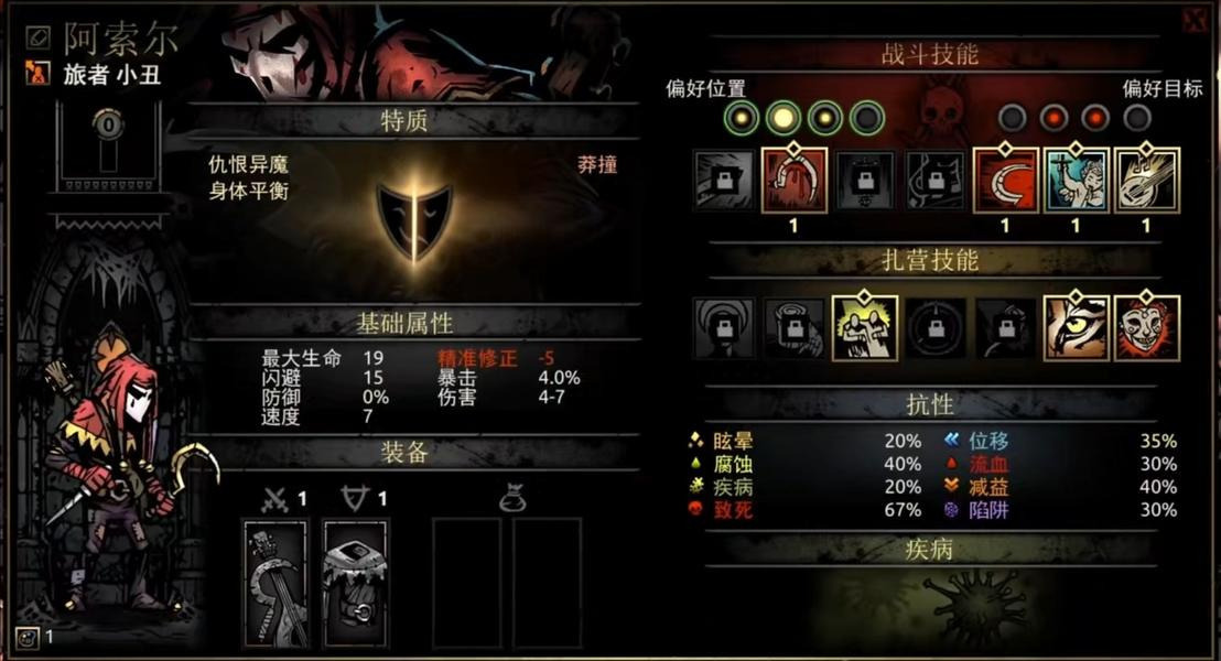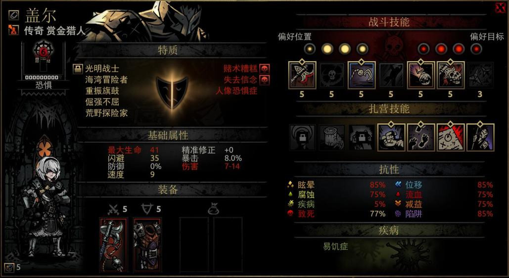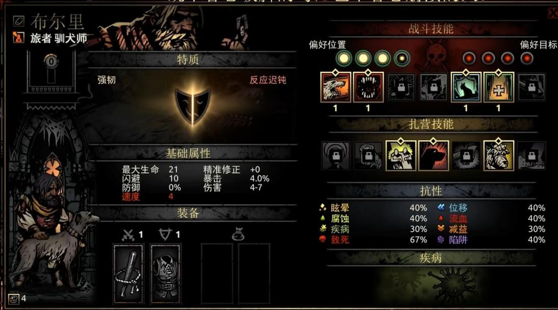 她的扎营技能“宿醉狂欢”可谓神技,只需要3点扎营点数和4个草药就能让全队-20压外加四场战斗的压力减免。7技能以3点扎营点数的代价换取四场战斗+10%的暴击率,打boss前或扎营点数有富裕可以用它。6技能则相对乏力,如果队伍带狗哥且恶女压力偏高的情况下可以使用。4技能在队伍确保不会乱位的情况下使用是很物超所值的。