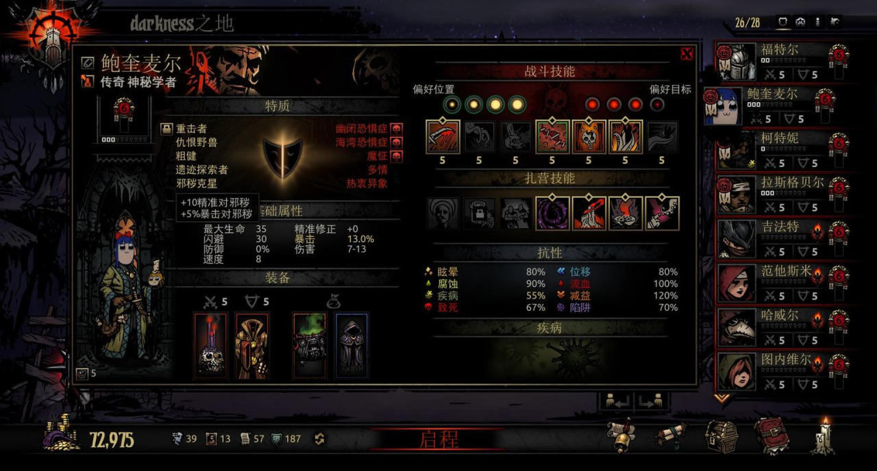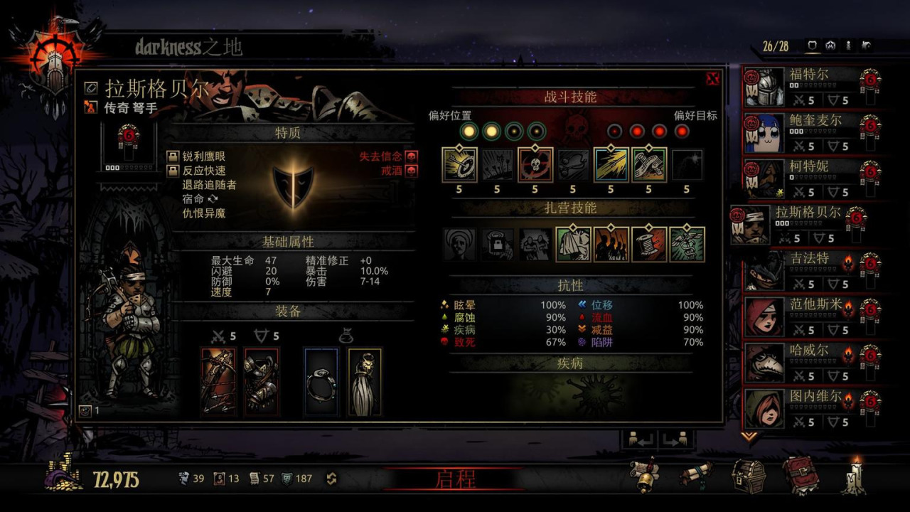 属性方面,伤害上限比狗哥只高了1点,生命比狗哥高了十多点,但作为一名后排这么高的血上限用处并不大。而且在无特质的情况下,弩手的速度比狗哥低2点,这意味着在战斗中我方极容易先挨一顿打,在狱火无光中一轮怪物的输出足以让你陷入濒死。所以属性方面弩手并不占优势。