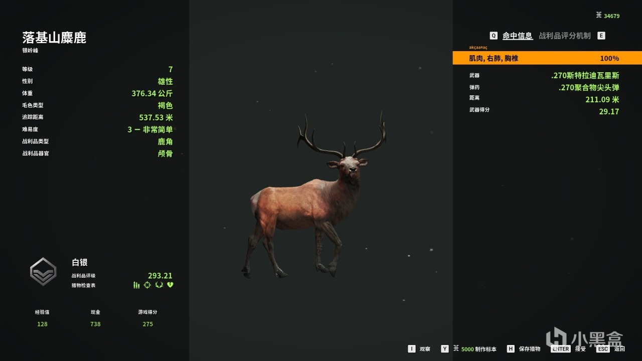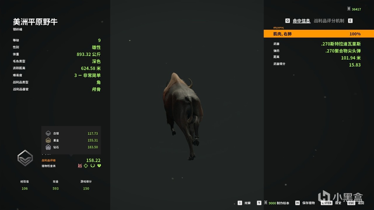 大家可以对比上面两图,就可以发现同一种枪,同样的一枪毙命,野牛的分数能够达到黄金,但是就因为我带的子弹不是打大型猎物的原因,直接掉级,变成白银。