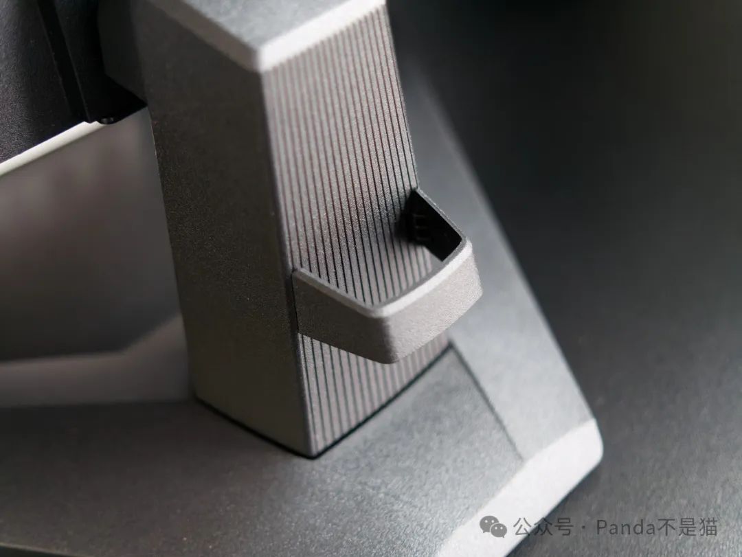 顯示器支架背面提供了一個塑料卡扣,能方便將線材全部集中走線。支架支持-5°~20°角度調節,在調節性上並不高,如果有豎置或者仰視等需求,熊貓建議可以考慮換第三方的顯示器支架,體驗會好一些。