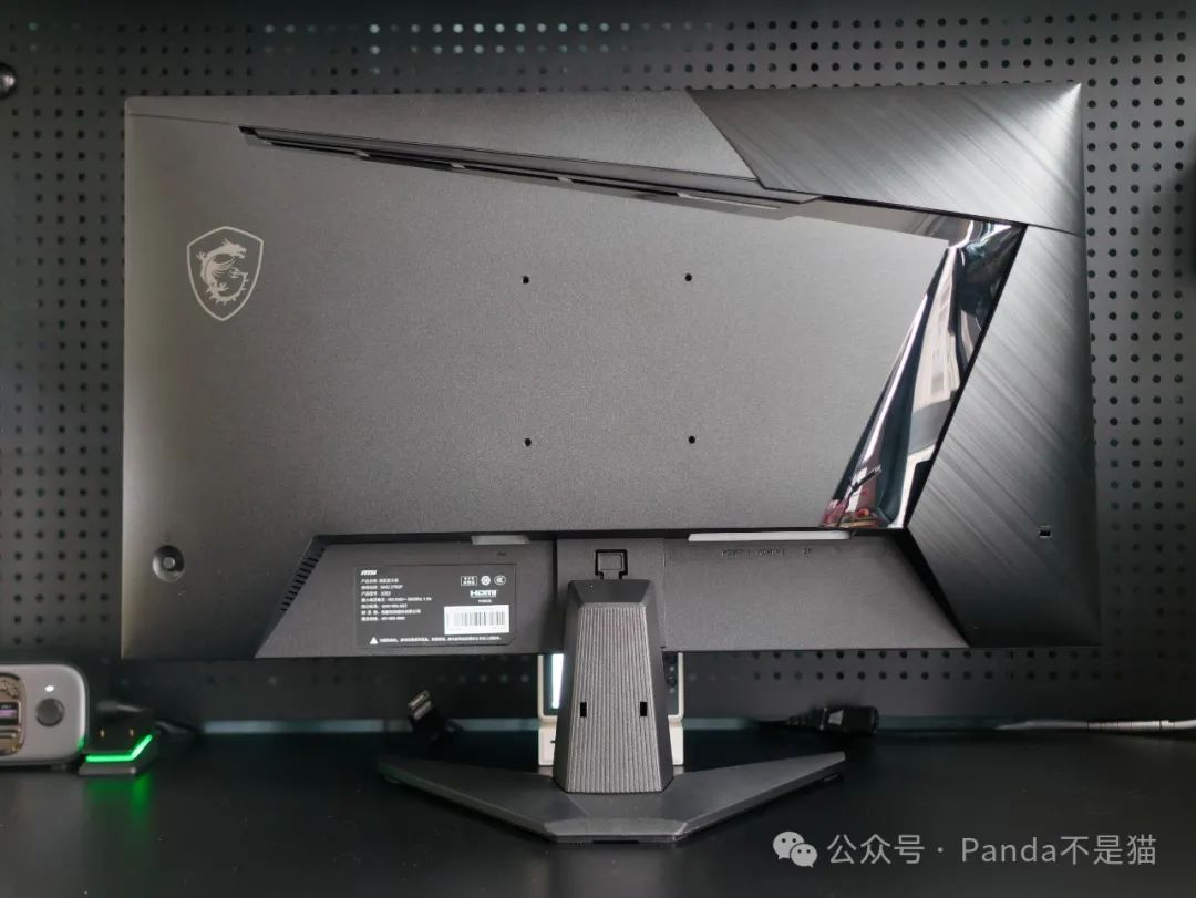背面設計非常新穎,和常規的大部分顯示器採用的對稱式不同,微星MAG 275QF用不規則的幾何圖形爲主要設計,左側線條一直延展到右側。背面採用了磨砂和拉絲兩種工藝,視覺效果還是蠻不錯的,左邊則是經典的微星龍盾標誌。