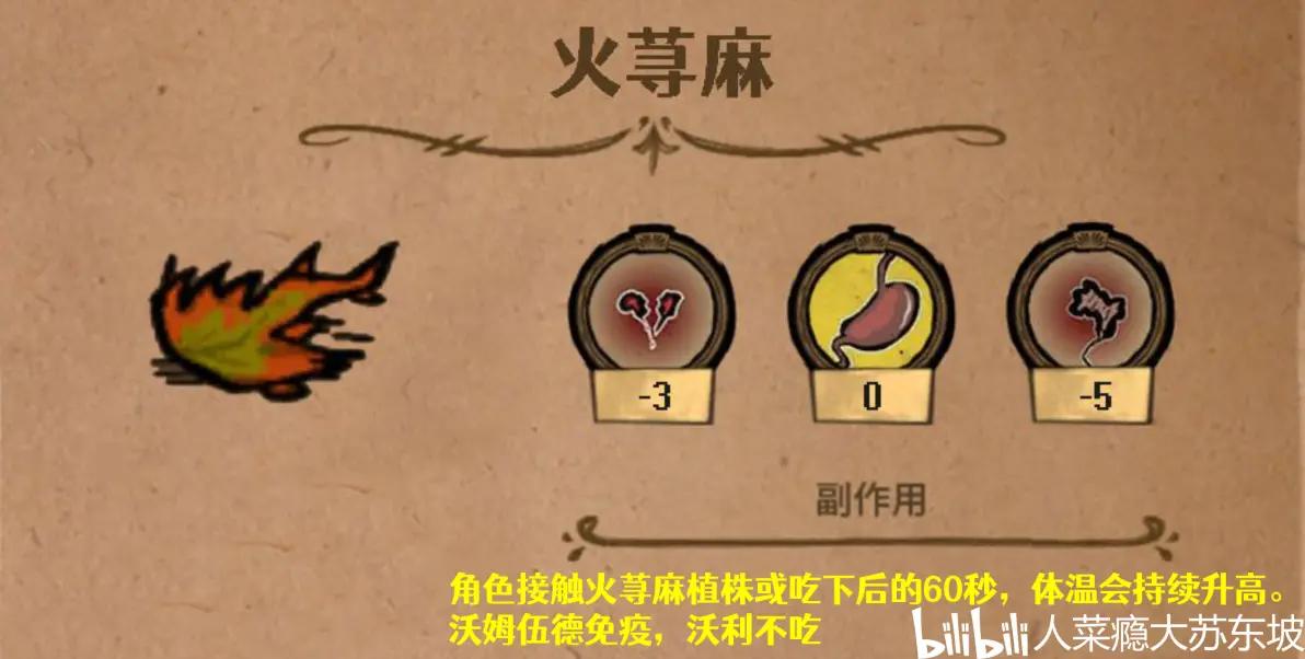 火蕁麻:只要接觸到即可有升溫效果,如果長出來可以留幾株,去田裏踩兩腳;採摘的火蕁麻保質期三天,冬季帶幾個出門也不錯,留意下負收益,及時補充就好了;個人覺得算是大廚特色菜以外最好用的升溫食物/物品了。