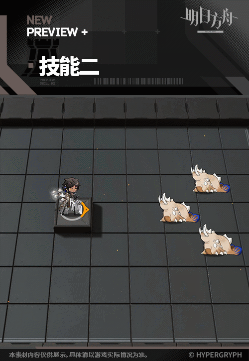 主動開啓:引星棘刺向阻擋數最低的數名幹員投擲鍊金單元,在數秒內使圍繞區域內的敵人攻擊力下降,防禦力下降,法術抗性下降(不疊加).每秒受到一定法術傷害,效果逐漸提升(數秒後達到最大)