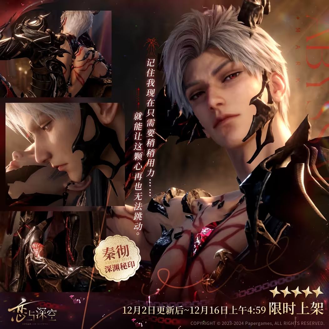 此外,《戀與深空》近幾個月推出的新卡池活動,題材選得也相當獨到,玩家和圈外人總能找到亮點。比如11月的「遵命,飼養官」混池活動,給男主們戴上了耳飾、尾飾,把重點放在了偏向獸化和對應的互動上;再比如今天的「龍影隕落處」卡池,秦徹化身爲龍,連圈外人都跑來稱讚《戀與深空》的美術、技術力。
