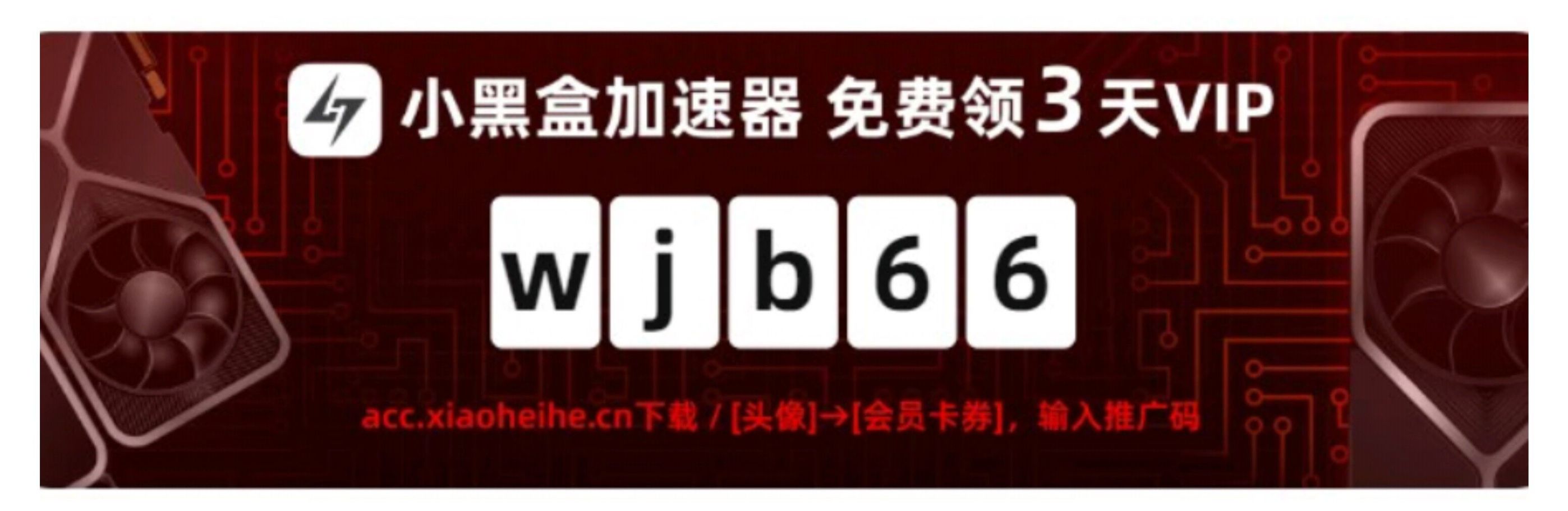 小黑盒加速器,点击会员充值→右上角会员卡卷→输入“kenan66”或"wjb66"即可每个月白嫖3天加速器。