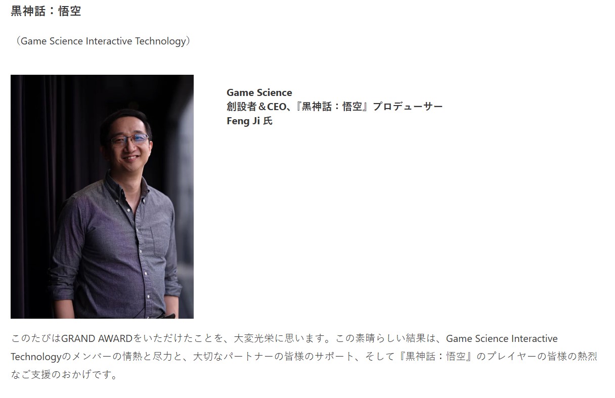 "獲得這個獎項屬實榮幸!這項成就要歸功於 Game Science Interactive Technology 所有成員的努力、我們重要夥伴的支持、以及《黑神話:悟空》所有玩家的熱烈支持。"