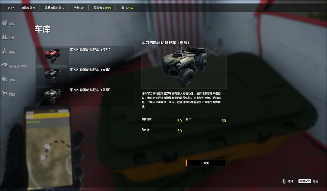四驱车,买一定要买,别听他们乱说,买车确实噪音大,但是哥们你确定你要走半个小时去开传送点吗?而且有时候还可以开车追猎物,我直接开车撵兔子🐰。