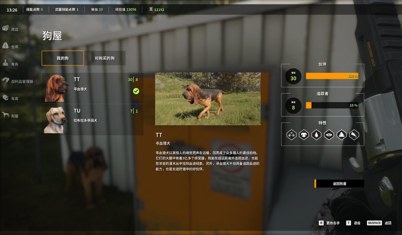 然后就是🐶我建议就是寻血猎犬或者新出的那只,拉布拉多没啥用,寻找受伤猎物的踪迹才是首要。