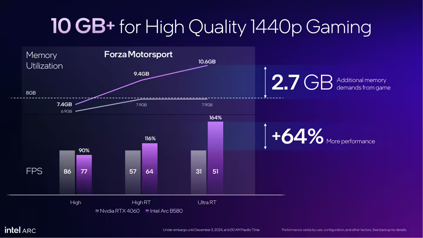 B580:20Xe2 核心,2670~2850MHz、12GB (192bit 19Gbps GDDR6)显存,190W TDP