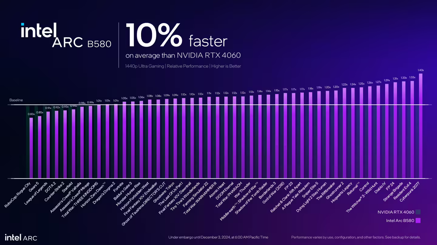 英特尔发布了基于 Xe2-HPG 架构新一代锐炫“Battlemage”桌面显卡,首发提供两款中端型号:B580 / B570。
