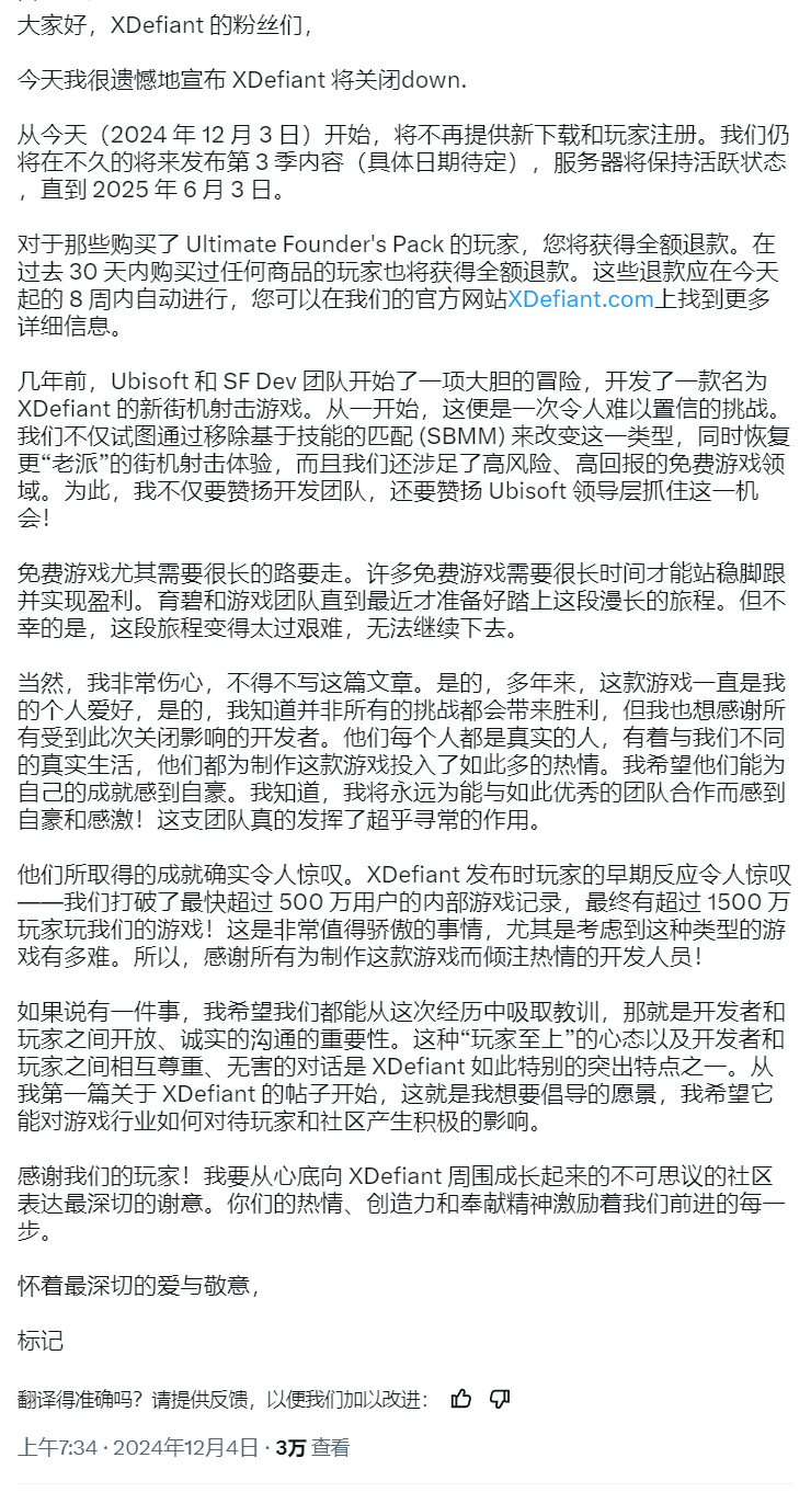 北京时间12月4日早上7点34分,育碧宣布旗下第一人称射击游戏《不羁联盟》将于2025年6月3日正式停服关闭。游戏总监Mark Rubin对此发长文进行告别: