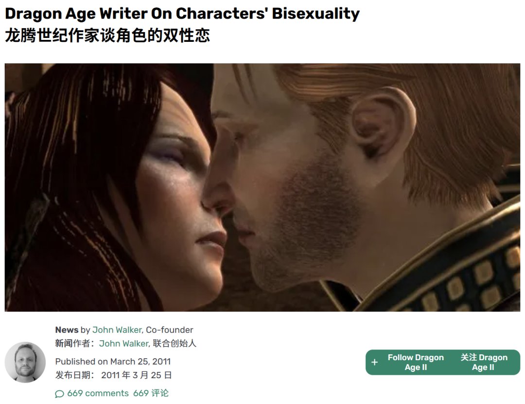 而龍騰世紀:起源的編劇 David Gaider,也在遊戲發售初期,直接公開表示正在作品中嘗試同性劇情,並在矮人族的對話裏有所體現;