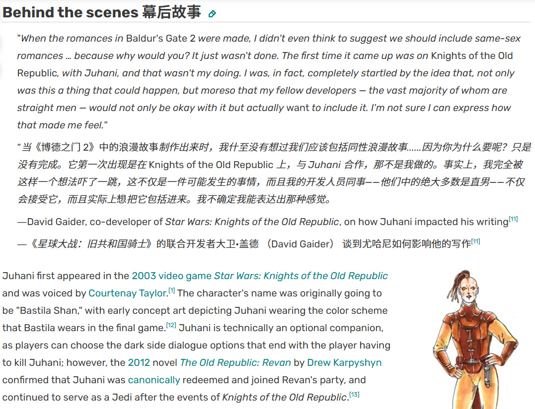 早在 2003 年,生軟開發者們就嘗試在《 星球大戰:舊共和國武士 》中加入女同性戀角色——Juhani。