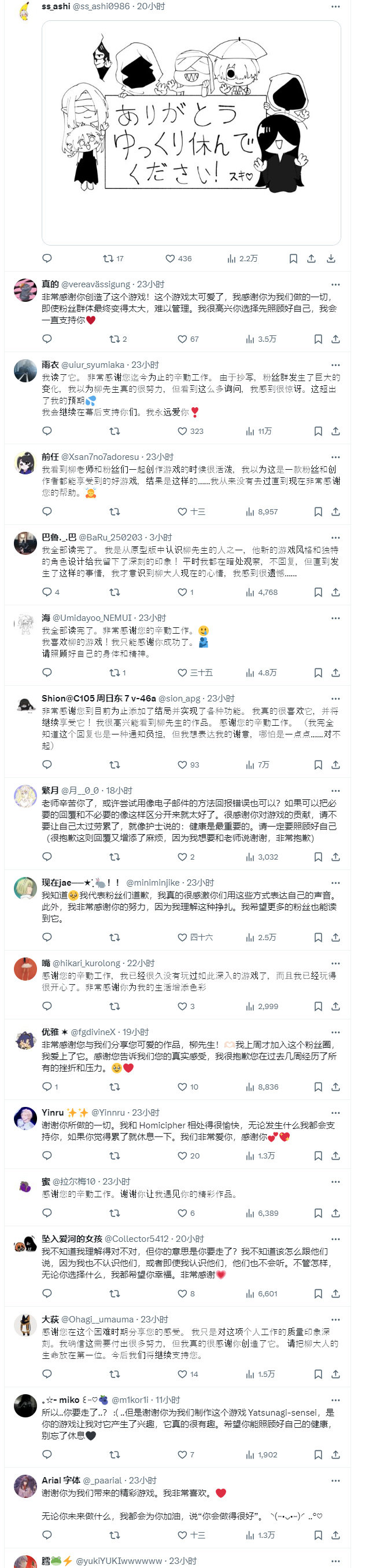這位身心疲憊不堪的創作者表示,回應粉絲的來信需要消耗她大量的時間,導致創作時間被壓縮,這比創作本身更累人。她自己目前還是有全職工作的,《文字化化》只是出於興趣在私人時間創作的遊戲。就是因爲遊戲過於火爆,讓她被粉絲弄得身心俱疲才決定徹底脫手抽身。