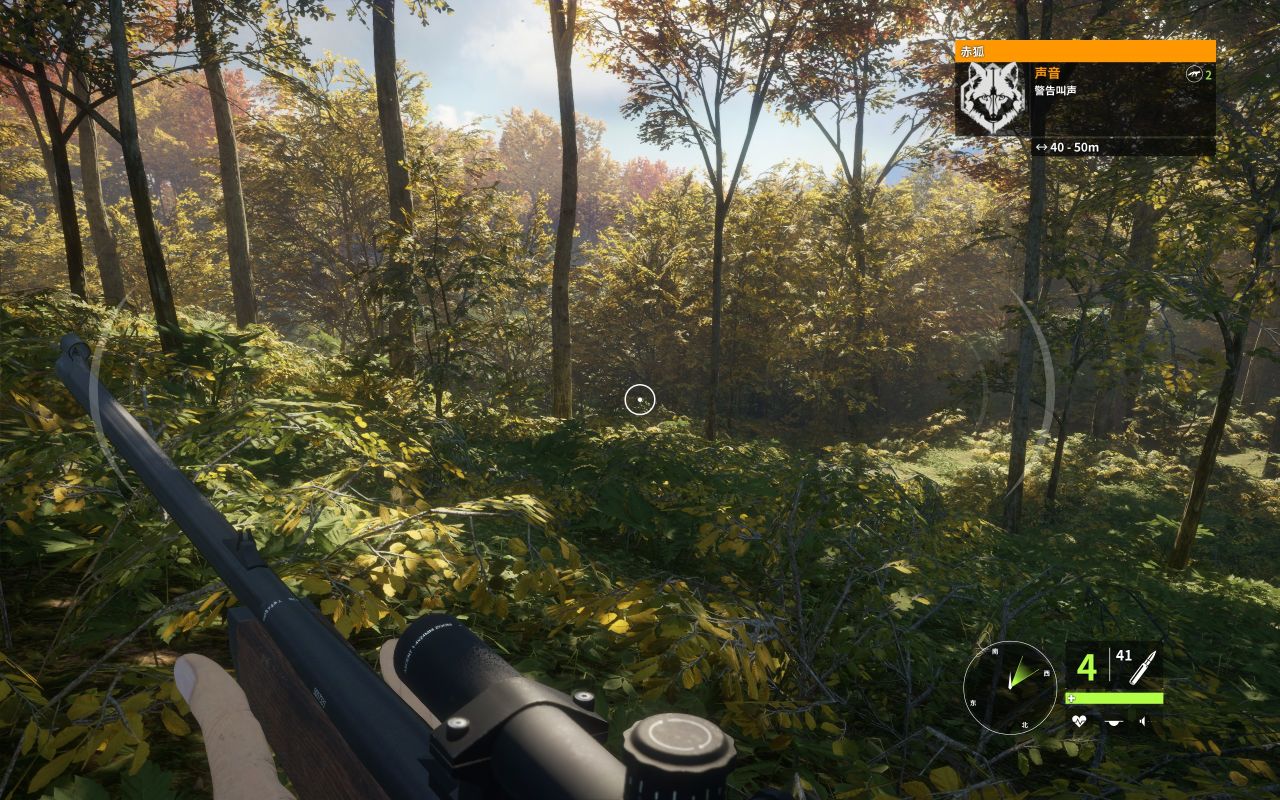 我们追踪猎物的方式有三种,分别是聆听声音,查看脚步和查看血迹。这些我们都可以很好的胜任,所以我觉得猎犬这个dlc可有可无,预算不充足的话不一定要买。有一点要注意的就是动物叫声提示离我们很近的话就不要再站着走了,容易把它们吓跑。