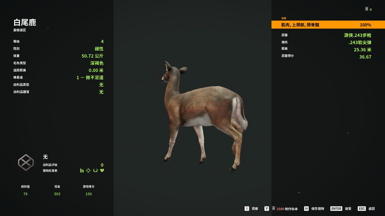每击杀一只猎物,我们都可以获得一个数据面板,我们可以花钱将其制作成标本,每一只猎物都是独一无二的