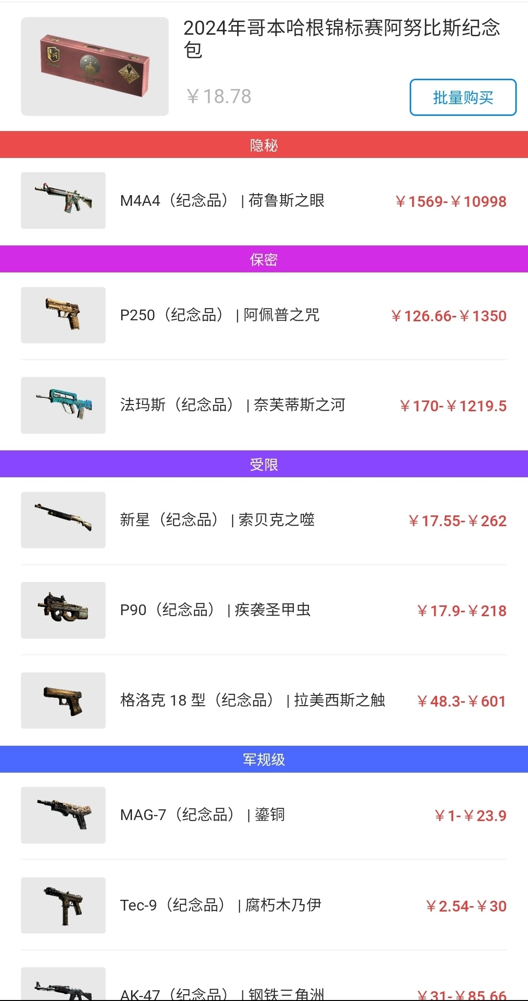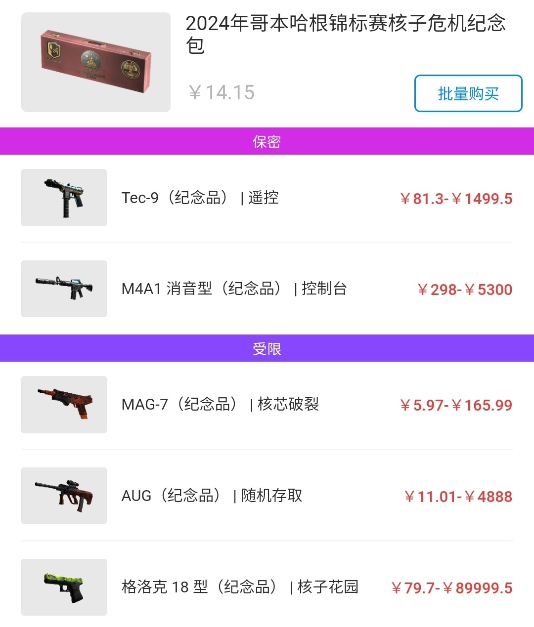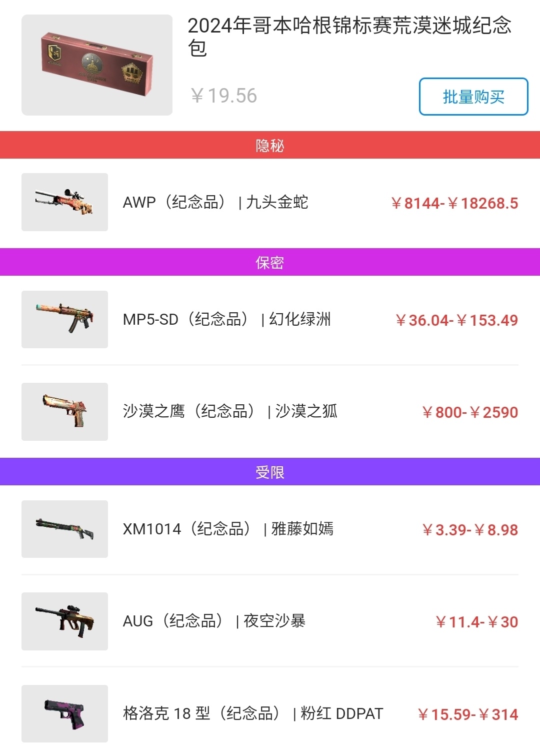 所以綜上分析,2024年上海Major僅有兩個紀念包無紅色品質,即:“核子危機”、“煉獄小鎮”。所以這2個紀念包的價值都會比其它5個紀念包低。這倆個13,其餘的21左右。