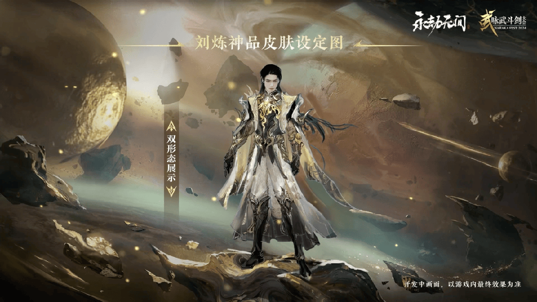 劉煉首件雙形態時裝【流金曉錦】以先秦神話中東方之神“東皇太一”爲原型,在第二形態下,強大的能量將把他的錦袍燒煉爲一身黑金勁甲;擊殺時刻,也會喚出天外隕石,將敵人一擊斃命。