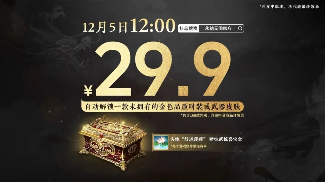 12月5日打開永劫無間官方直播間,29.9帶走【詠武驚喜寶盒】——使用後將在海量極品外觀中,隨機獲得一件你【未擁有的時裝或武器外觀】。