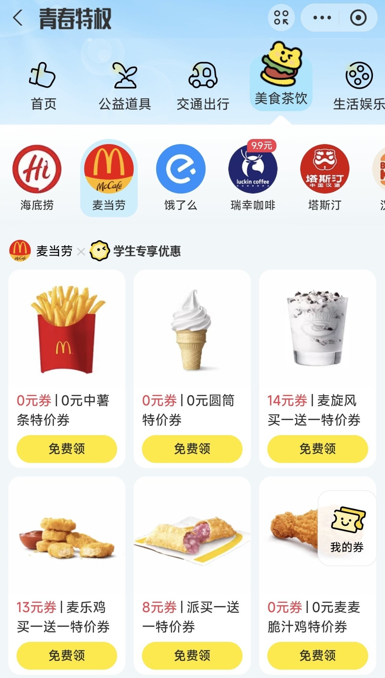 進入青春特權,找到上面有0元字樣的麥當勞,接着點進去。